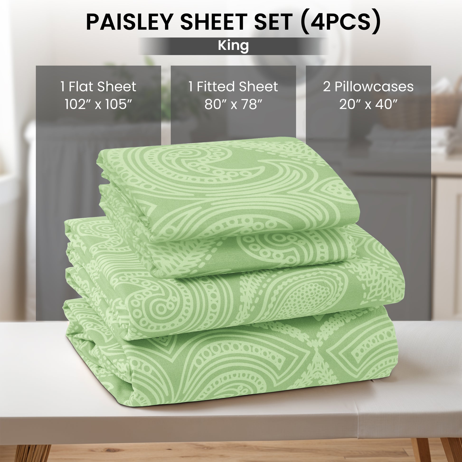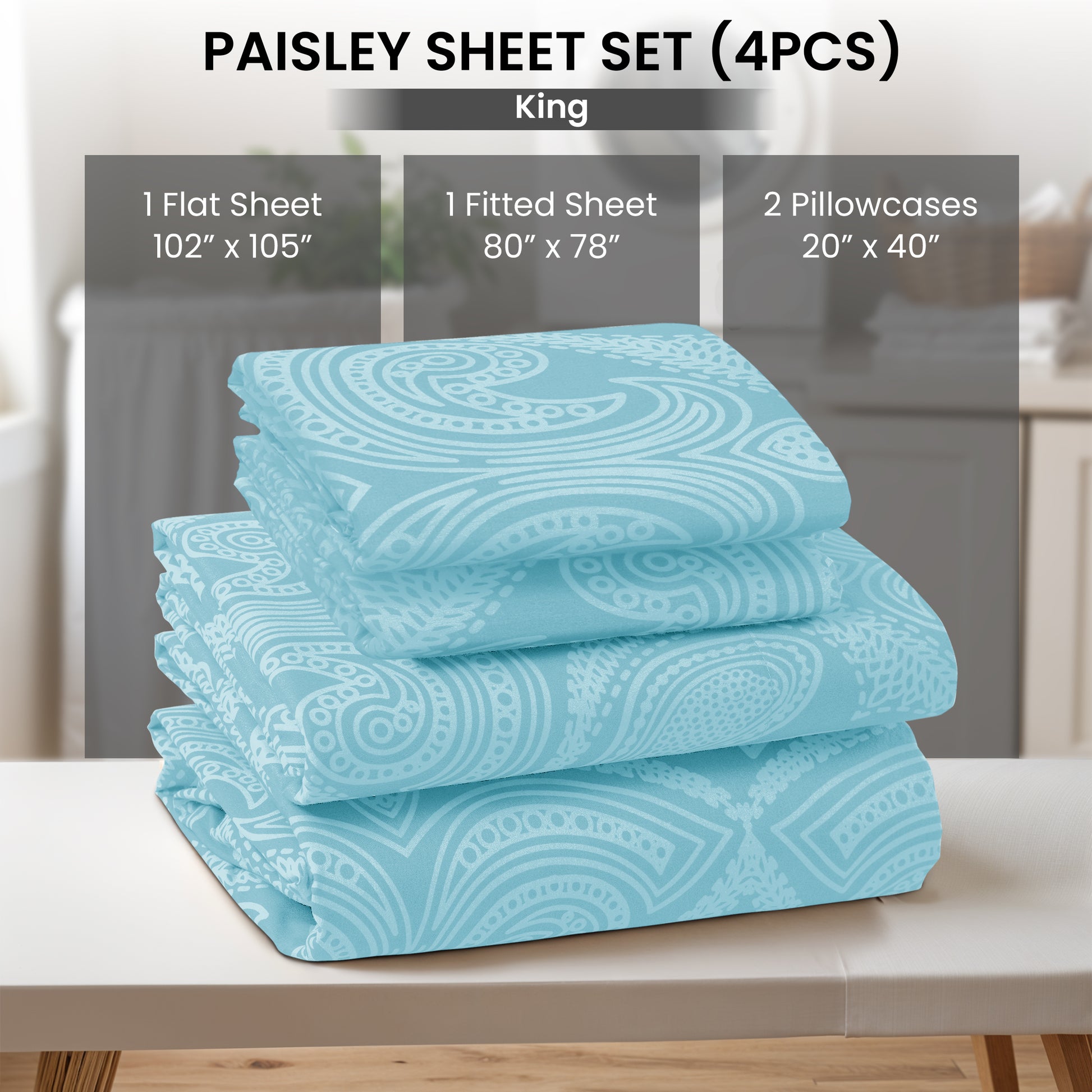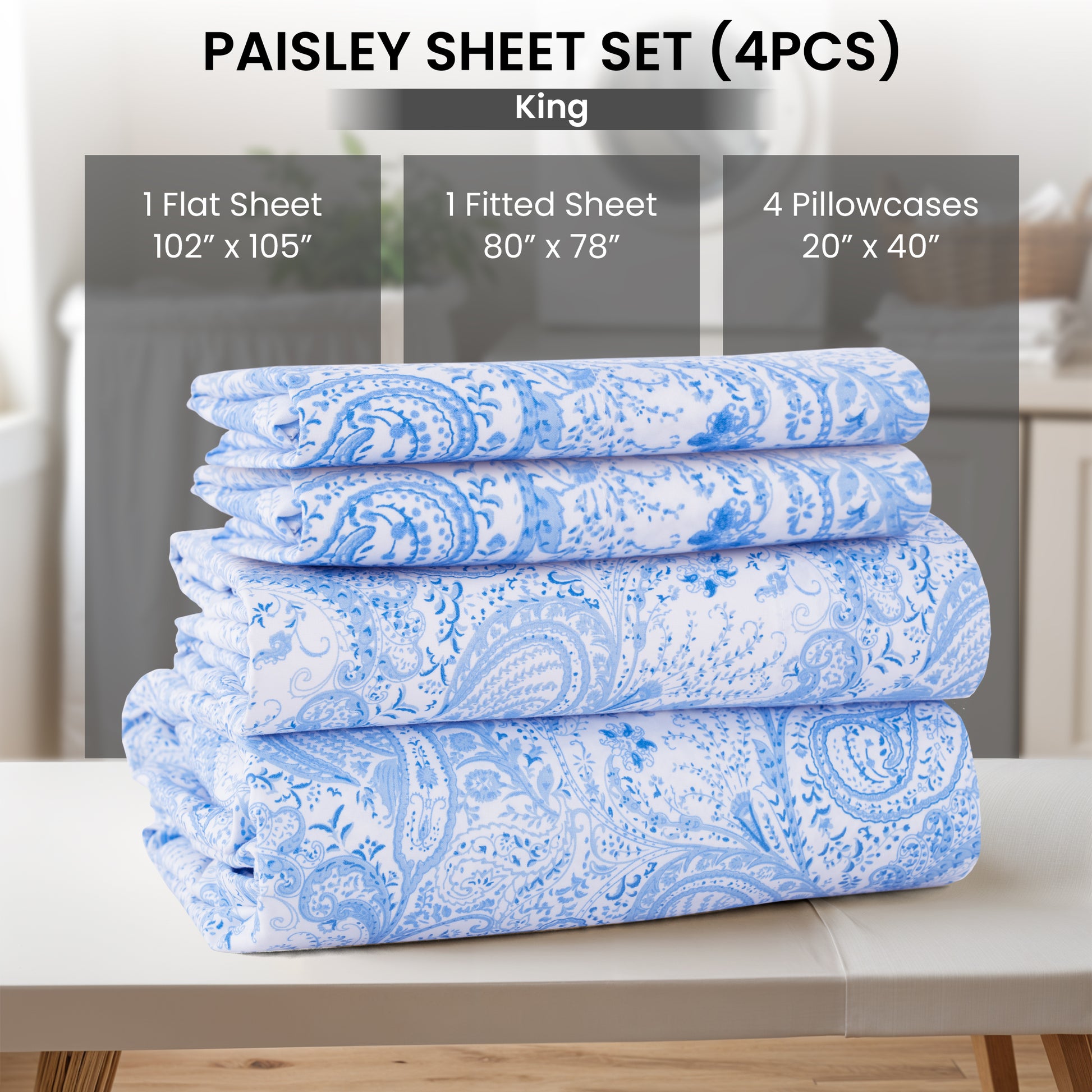 King Size Set Includes: 1 King Fitted Sheet: 78" W x 80" L 1 King Flat Sheet: 102" W x 105" L 2 King Pillowcase: 20" W x 40" L |