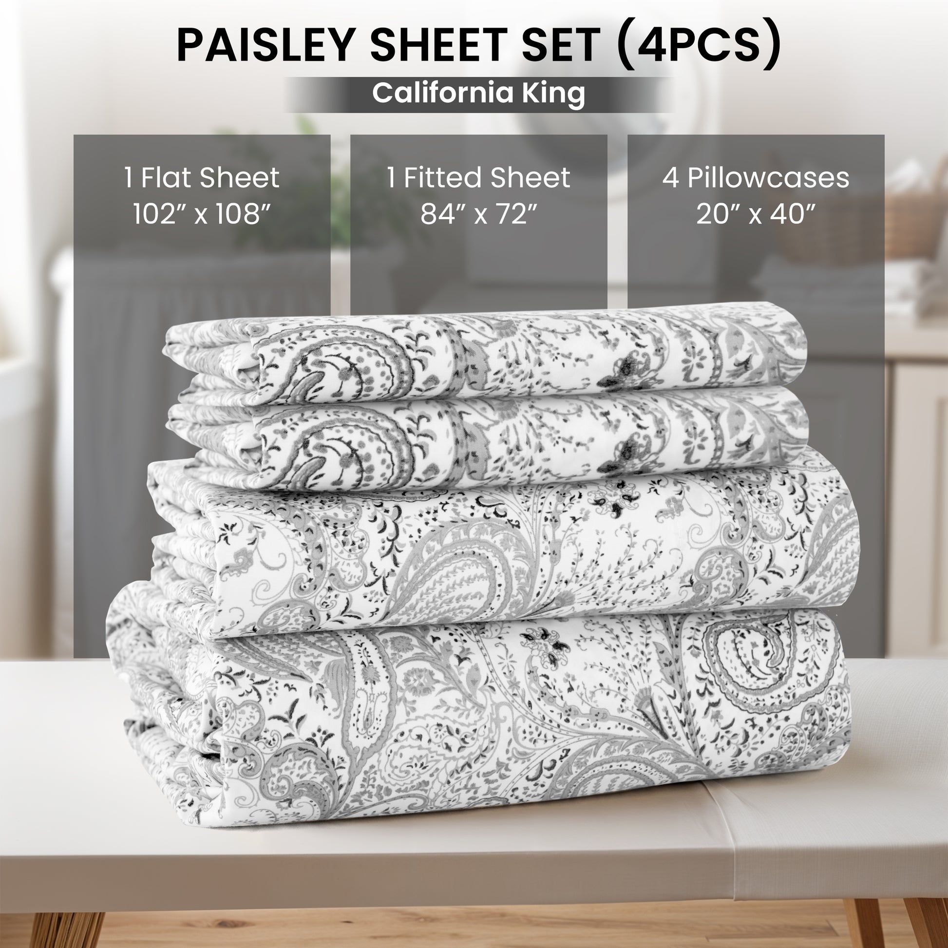 California King Size Set Includes: 1 California King Fitted Sheet: 72" W x 84" L 1 California King Flat Sheet: 108" W x 102" L 2 King Pillowcase: 20" W x 40" L |