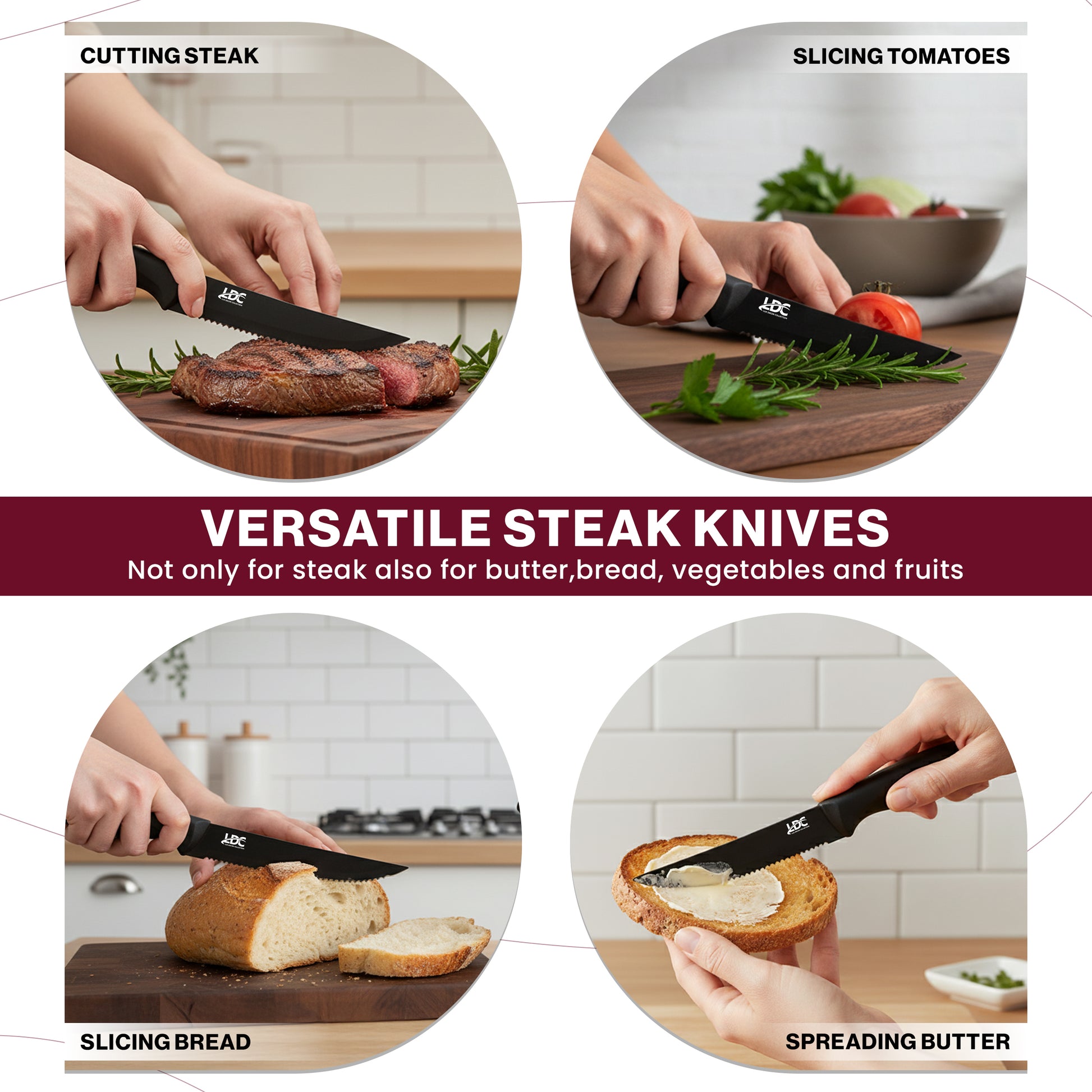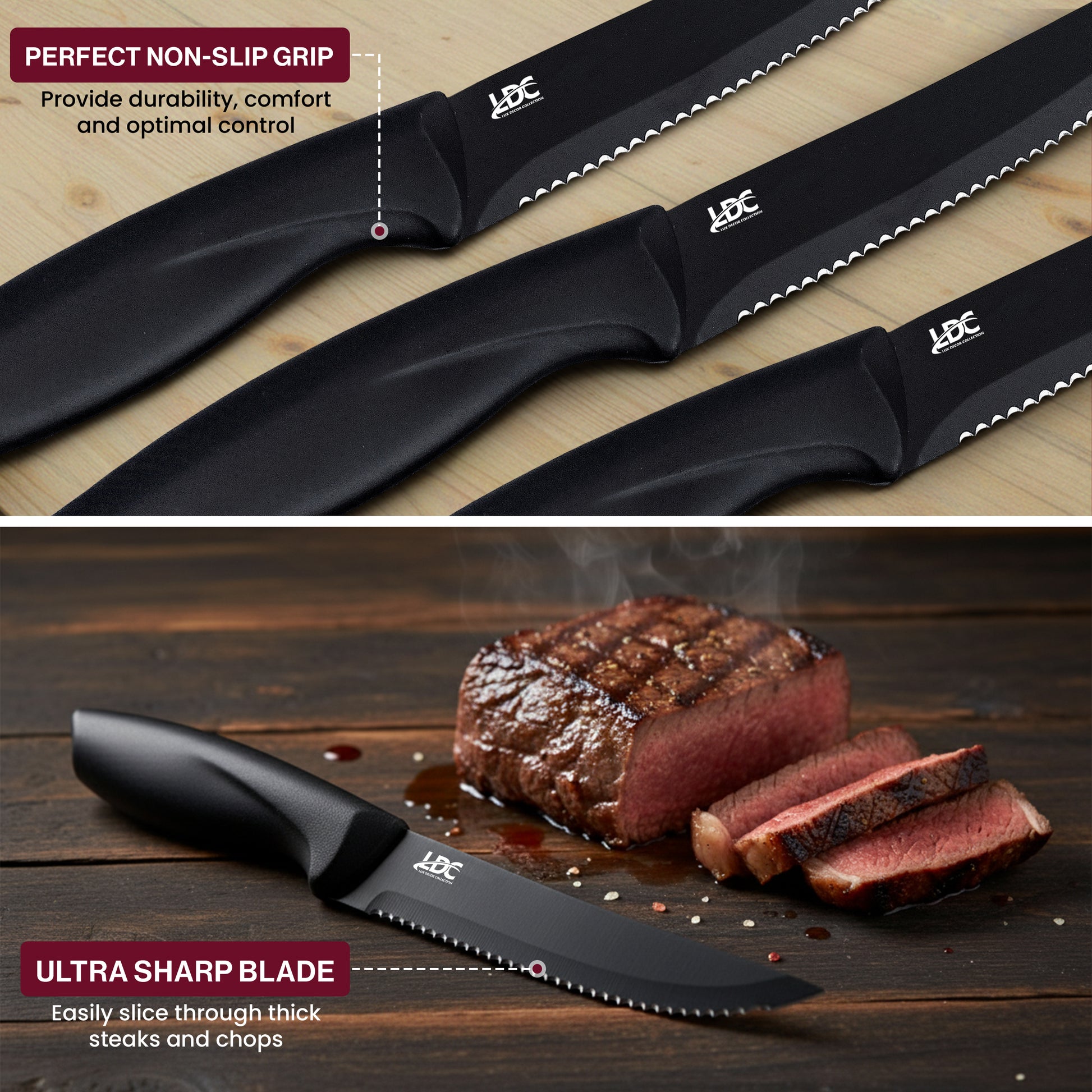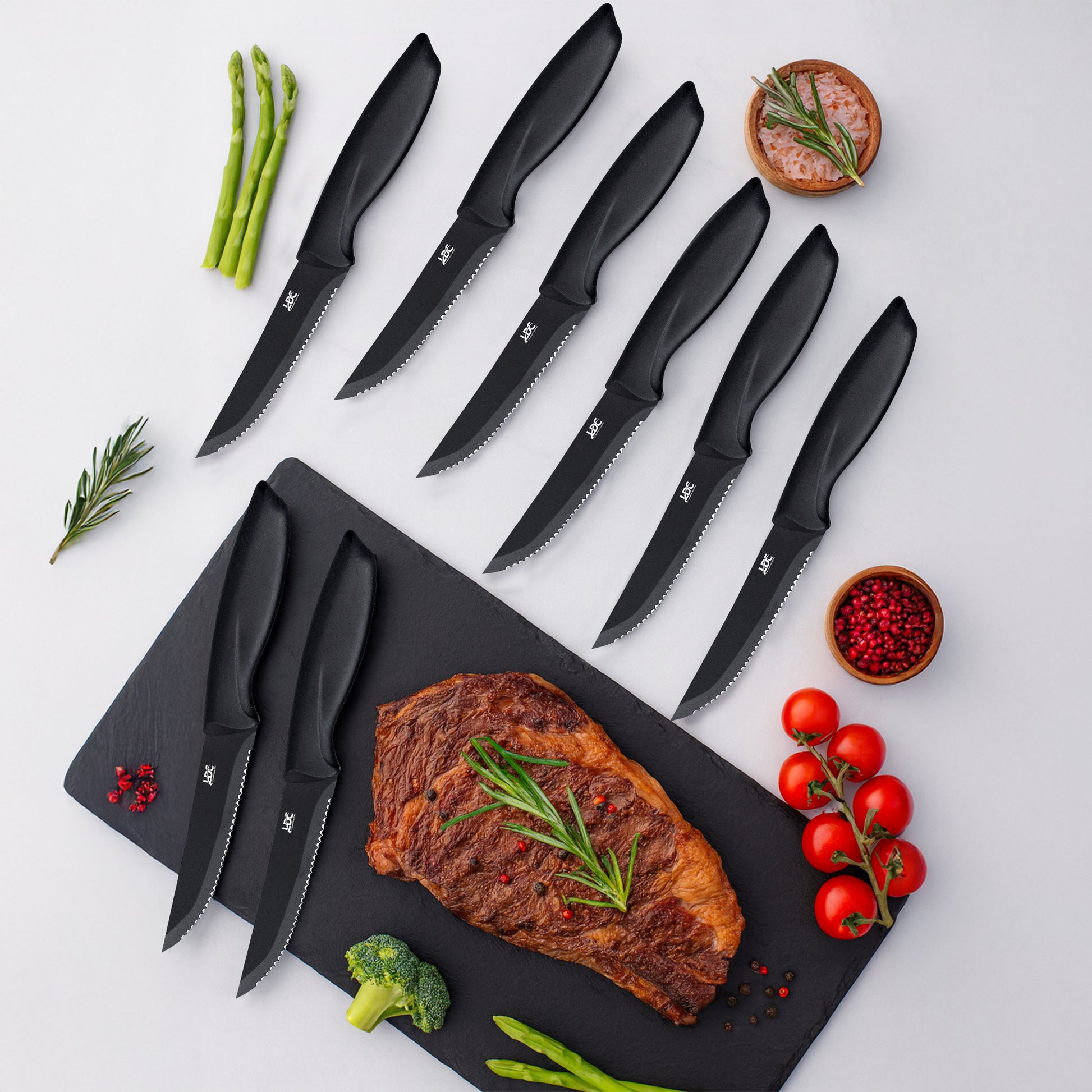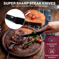 - Great Durability steak knife set has knives with extra sturdy and robust polypropylene handles with a protective coating that makes these knives easier to grip and use.